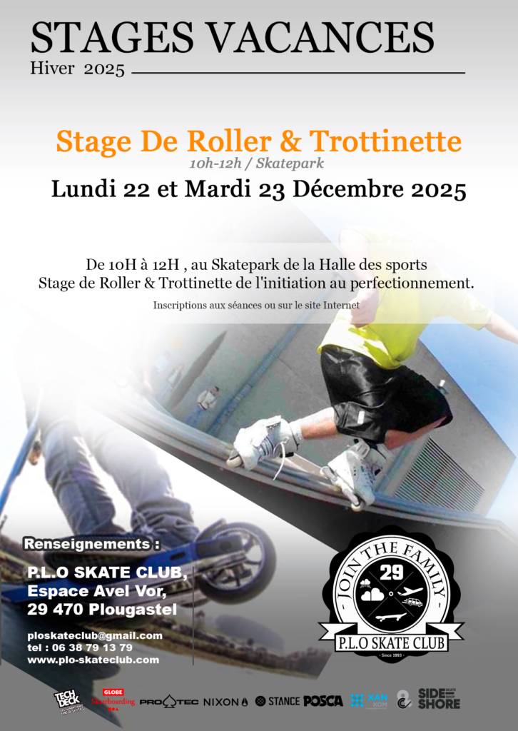 Le P.L.O Skate Club propose des stages de Roller et de Trottinette de l’initiation au perfectionnement sur les vacances d’Hiver 2025.